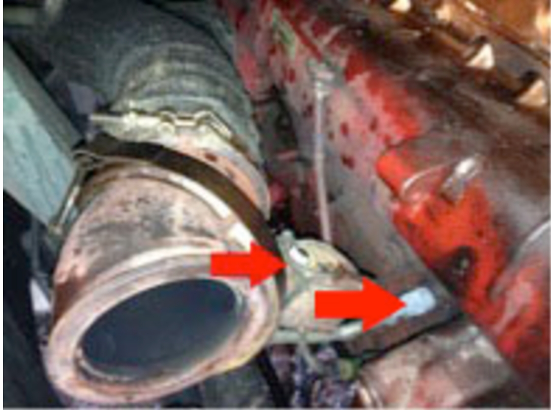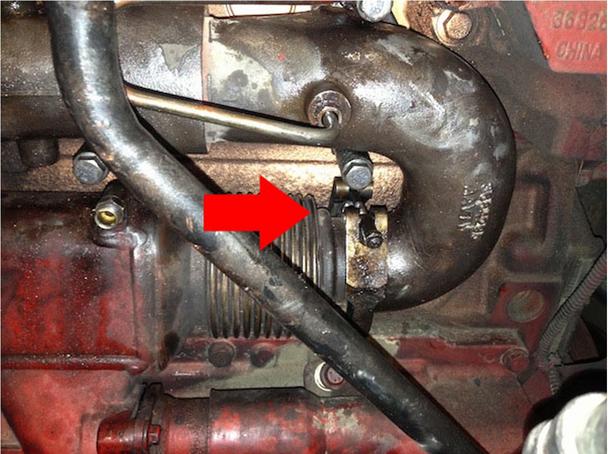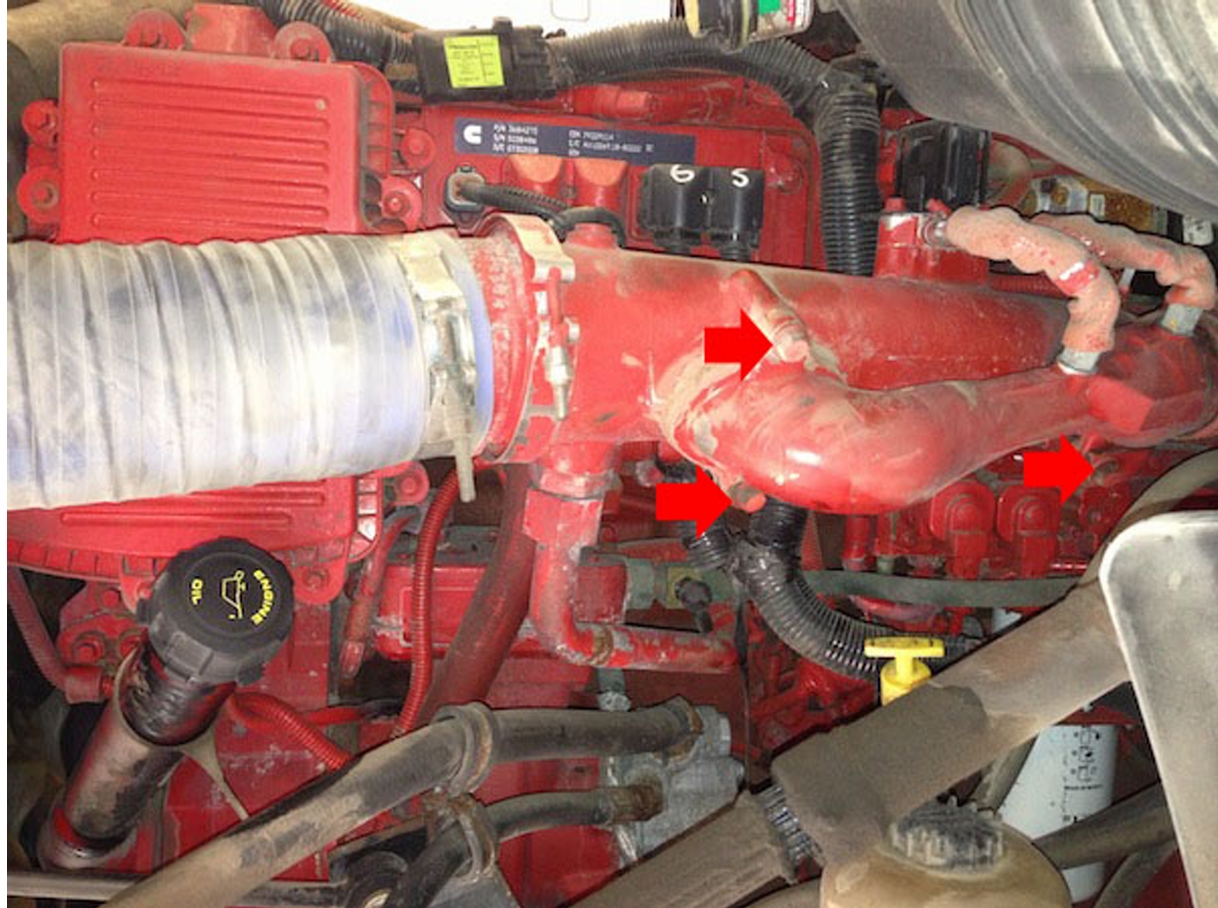 Locate the coolant elbow below the EGR cooler on the rear side of the engine.