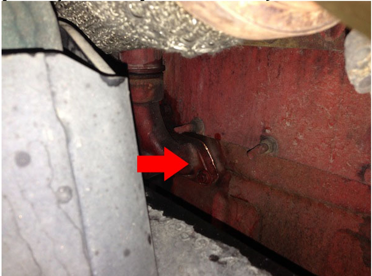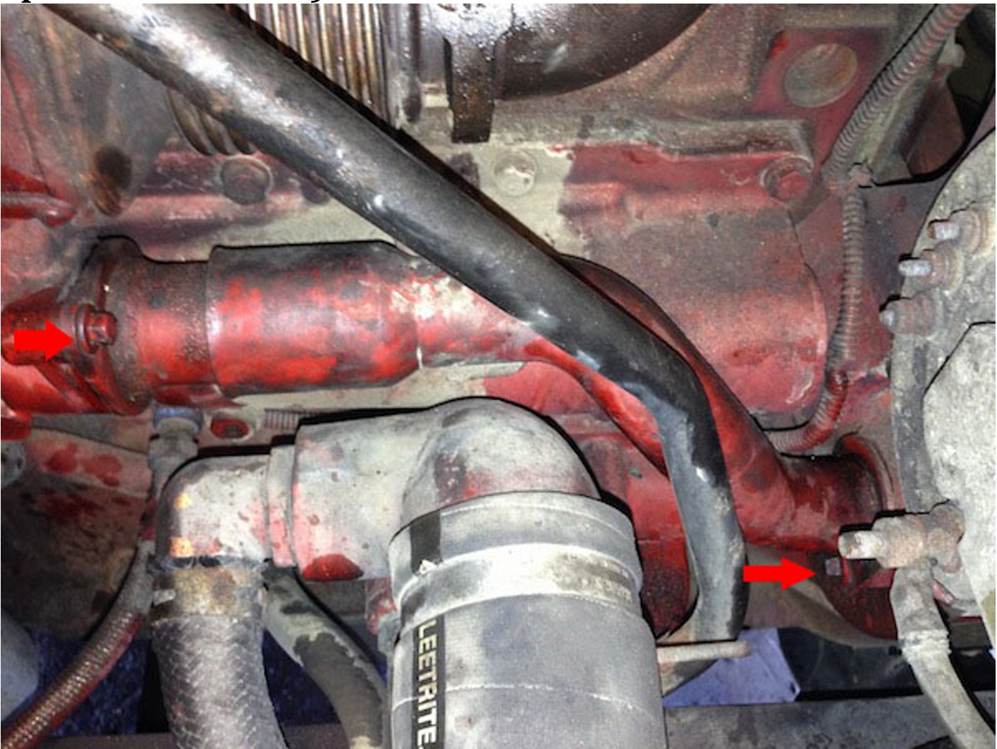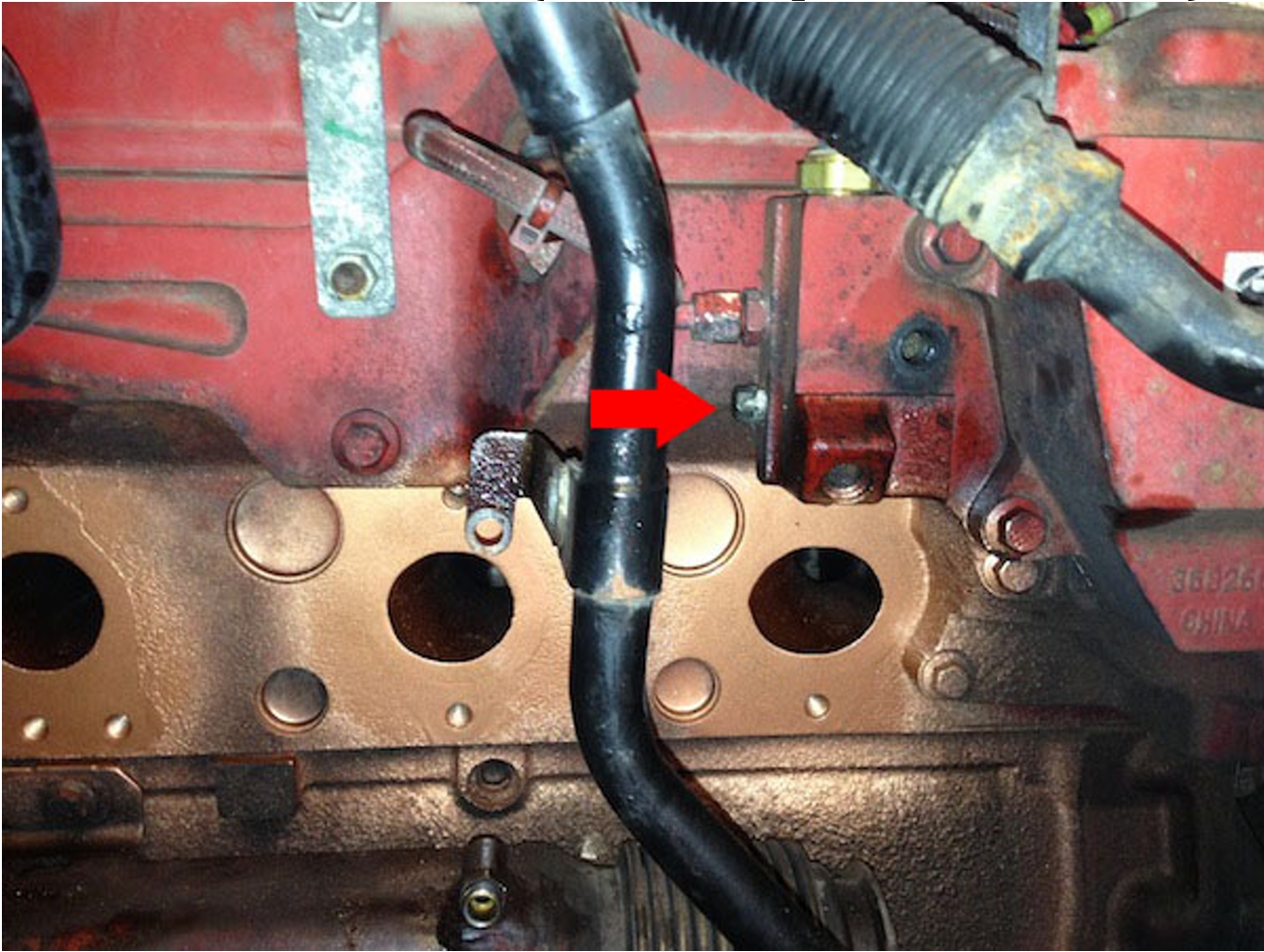 Locate the coolant elbow below the EGR cooler on the rear side of the engine.